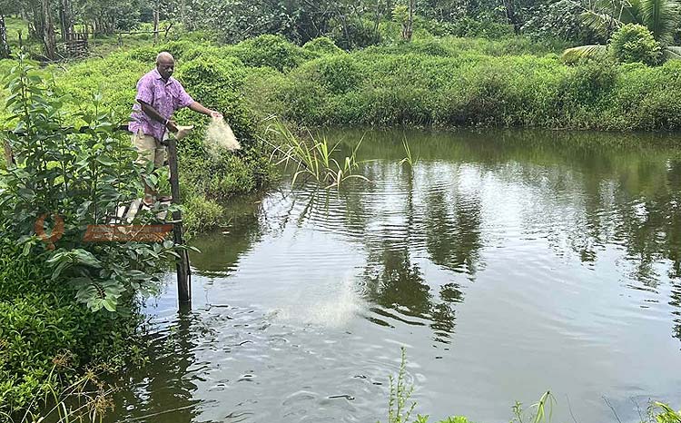 Small holder Tilapia farmer feeding his pond in Serua Province of Fiji Island