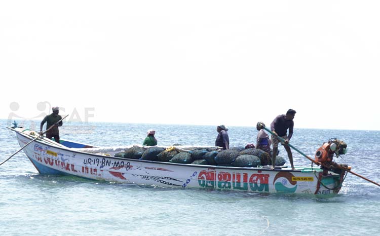 Women wild seaweed harvesters return to shore, seated atop the freshly gathered seaweed, while the boats are steered by men