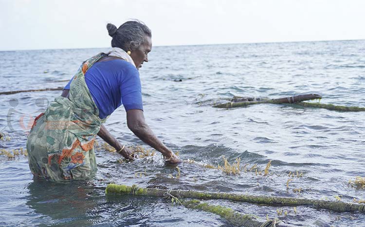 Every morning, women seaweed farmers lift and dip rope-tied strands, carefully cleaning the rafts and nurturing the seaweed to keep it healthy and fresh