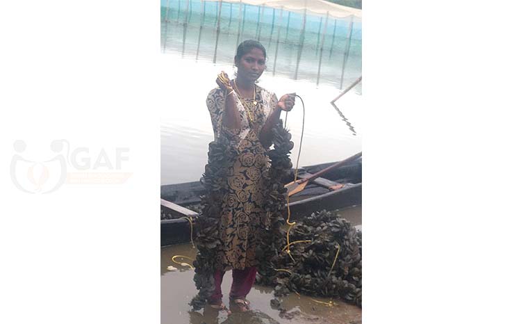 Strength in shells: Women shaping the future of aquaculture. A woman farmer from Kannur, Kerala, India, proudly displays her mussel harvest